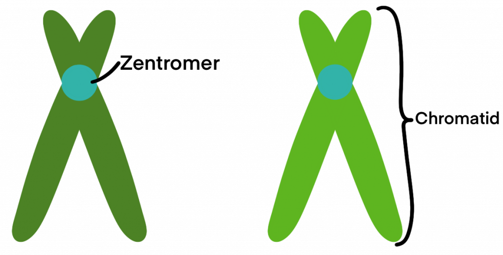 Jedes Chromosom besteht aus zwei identischen Chromatiden, sie werden in der Mitte durch das Zentromer zusammengehalten
